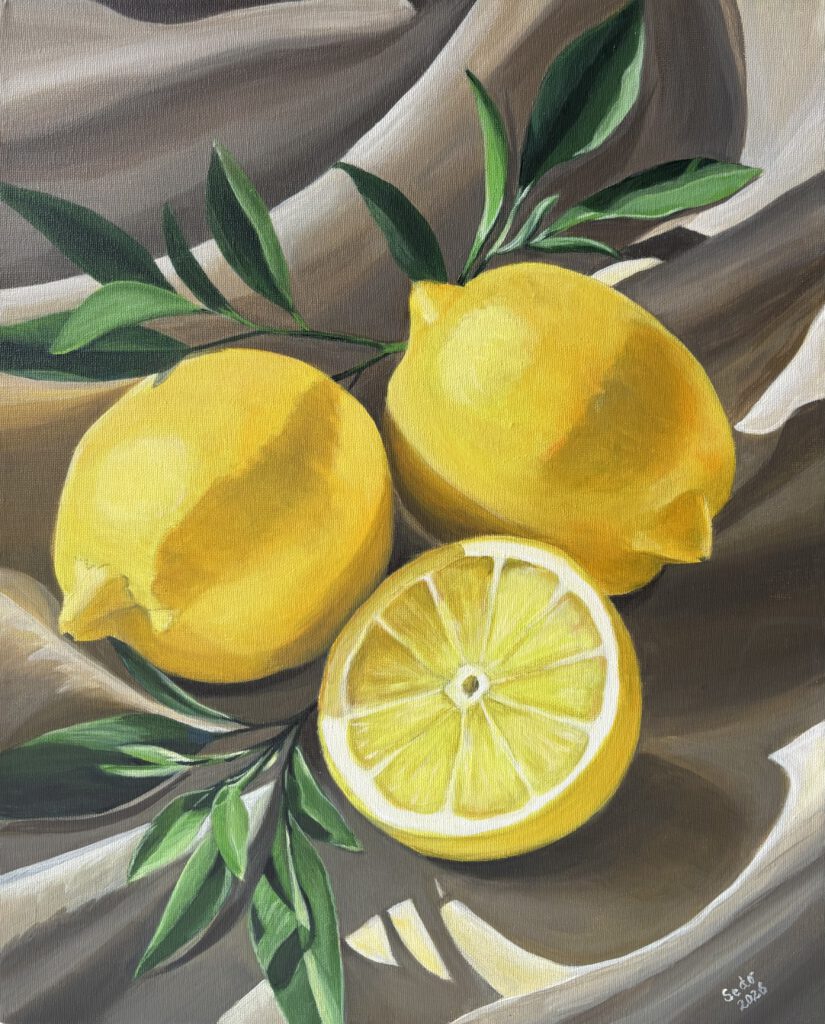 Stillleben Zitronen I, 2026, Ruth Sedo, Acryl auf Leinwand, 60 x 60 cm (verfügbar) Zitronen II, 2026, Ruth Sedo, Acryl auf Leinwand, 50 x 40 cm (verfügbar)